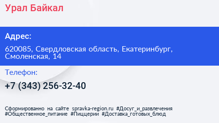 Урал-Байкал по адресу 620085, Свердловская область, Екатеринбург, Смоленская, 14 в дальнейшем Организация, размещена в следующих категориях: