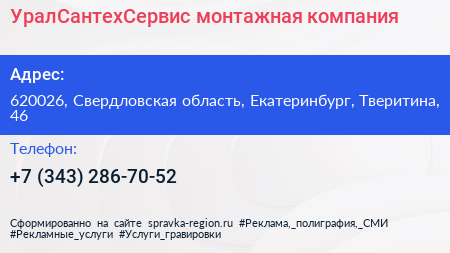 УралСантехСервис, монтажная компания по адресу 620026, Свердловская область, Екатеринбург, Тверитина, 46 в дальнейшем Организация, размещена в следующих категориях: