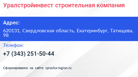 Уралстройинвест, строительная компания по адресу 620131, Свердловская область, Екатеринбург, Татищева, 98 в дальнейшем Организация, размещена в следующих категориях: