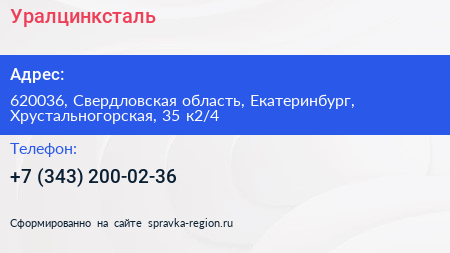 Уралцинксталь по адресу 620036, Свердловская область, Екатеринбург, Хрустальногорская, 35 к2/4 в дальнейшем Организация, размещена в следующих категориях: