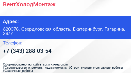 ВентХолодМонтаж по адресу 620078, Свердловская область, Екатеринбург, Гагарина, 28/7 в дальнейшем Организация, размещена в следующих категориях: