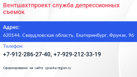 Вентшахтпроект, служба депрессионных съемок по адресу 620144, Свердловская область, Екатеринбург, Фрунзе, 96 в дальнейшем Организация, размещена в следующих категориях: