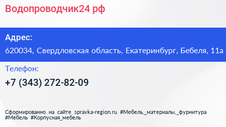 Водопроводчик24.рф по адресу 620034, Свердловская область, Екатеринбург, Бебеля, 11а в дальнейшем Организация, размещена в следующих категориях: