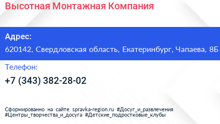 Высотная Монтажная Компания по адресу 620142, Свердловская область, Екатеринбург, Чапаева, 8Б в дальнейшем Организация, размещена в следующих категориях: