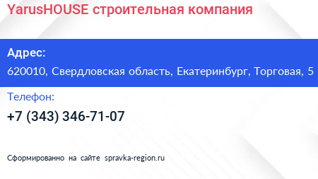 YarusHOUSE, строительная компания по адресу 620010, Свердловская область, Екатеринбург, Торговая, 5 в дальнейшем Организация, размещена в следующих категориях: