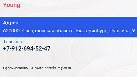 Young по адресу 620000, Свердловская область, Екатеринбург, Пушкина, 9 в дальнейшем Организация, размещена в следующих категориях: