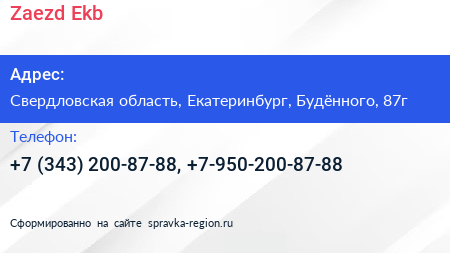Zaezd-Ekb по адресу Свердловская область, Екатеринбург, Будённого, 87г в дальнейшем Организация, размещена в следующих категориях: