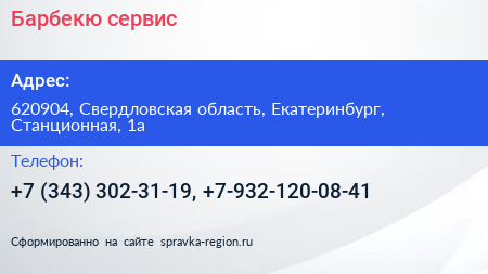 Барбекю сервис по адресу 620904, Свердловская область, Екатеринбург, Станционная, 1а в дальнейшем Организация, размещена в следующих категориях: