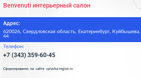Benvenuti, интерьерный салон по адресу 620026, Свердловская область, Екатеринбург, Куйбышева, 44 в дальнейшем Организация, размещена в следующих категориях: