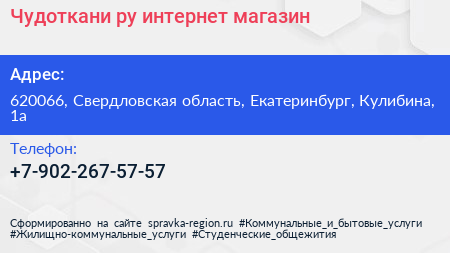 Чудоткани.ру, интернет-магазин по адресу 620066, Свердловская область, Екатеринбург, Кулибина, 1а в дальнейшем Организация, размещена в следующих категориях:
