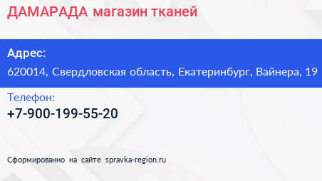 ДАМАРАДА, магазин тканей по адресу 620014, Свердловская область, Екатеринбург, Вайнера, 19 в дальнейшем Организация, размещена в следующих категориях: