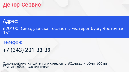 Декор-Сервис по адресу 620100, Свердловская область, Екатеринбург, Восточная, 162 в дальнейшем Организация, размещена в следующих категориях: