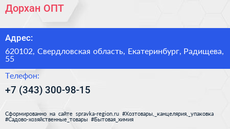 Дорхан-ОПТ по адресу 620102, Свердловская область, Екатеринбург, Радищева, 55 в дальнейшем Организация, размещена в следующих категориях: