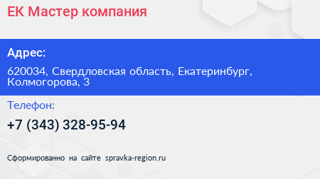ЕК-Мастер, компания по адресу 620034, Свердловская область, Екатеринбург, Колмогорова, 3 в дальнейшем Организация, размещена в следующих категориях: