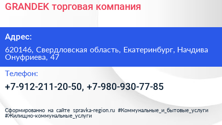 GRANDEK, торговая компания по адресу 620146, Свердловская область, Екатеринбург, Начдива Онуфриева, 47 в дальнейшем Организация, размещена в следующих категориях: