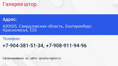 Галерея штор по адресу 620105, Свердловская область, Екатеринбург, Краснолесья, 133 в дальнейшем Организация, размещена в следующих категориях: