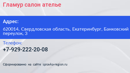 Гламур, салон-ателье по адресу 620014, Свердловская область, Екатеринбург, Банковский переулок, 3 в дальнейшем Организация, размещена в следующих категориях: