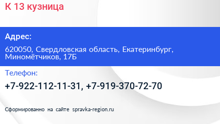 К-13, кузница по адресу 620050, Свердловская область, Екатеринбург, Миномётчиков, 17Б в дальнейшем Организация, размещена в следующих категориях: