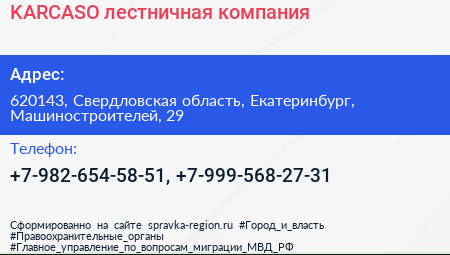 KARCASO, лестничная компания по адресу 620143, Свердловская область, Екатеринбург, Машиностроителей, 29 в дальнейшем Организация, размещена в следующих категориях:
