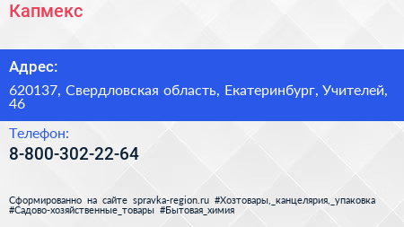 Капмекс по адресу 620137, Свердловская область, Екатеринбург, Учителей, 46 в дальнейшем Организация, размещена в следующих категориях: