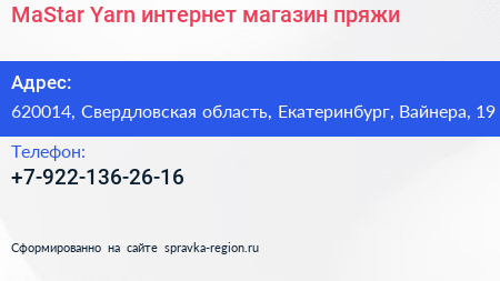 MaStar-Yarn, интернет-магазин пряжи по адресу 620014, Свердловская область, Екатеринбург, Вайнера, 19 в дальнейшем Организация, размещена в следующих категориях: