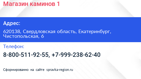 Магазин каминов №1 по адресу 620138, Свердловская область, Екатеринбург, Чистопольская, 6 в дальнейшем Организация, размещена в следующих категориях:
