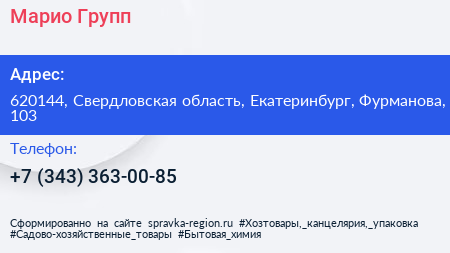 Марио Групп по адресу 620144, Свердловская область, Екатеринбург, Фурманова, 103 в дальнейшем Организация, размещена в следующих категориях: