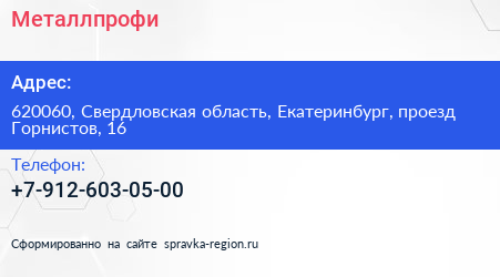Металлпрофи по адресу 620060, Свердловская область, Екатеринбург, проезд Горнистов, 16 в дальнейшем Организация, размещена в следующих категориях: