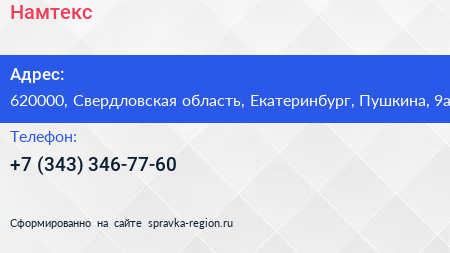 Намтекс по адресу 620000, Свердловская область, Екатеринбург, Пушкина, 9а в дальнейшем Организация, размещена в следующих категориях: