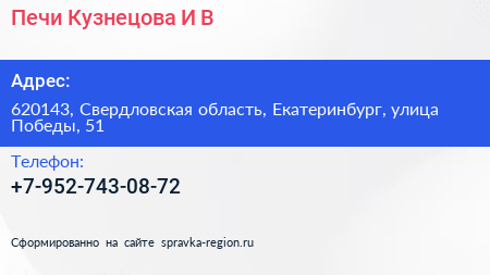 Печи Кузнецова И.В. по адресу 620143, Свердловская область, Екатеринбург, улица Победы, 51 в дальнейшем Организация, размещена в следующих категориях: