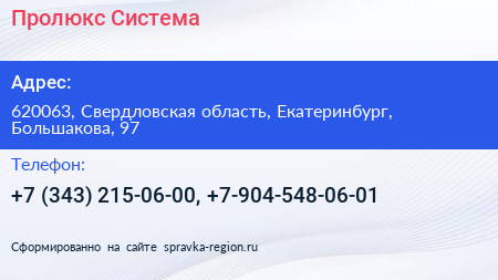 Пролюкс Система по адресу 620063, Свердловская область, Екатеринбург, Большакова, 97 в дальнейшем Организация, размещена в следующих категориях: