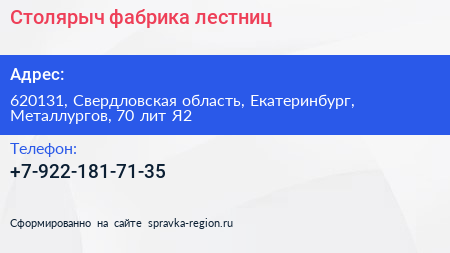 Столярыч, фабрика лестниц по адресу 620131, Свердловская область, Екатеринбург, Металлургов, 70 лит Я2 в дальнейшем Организация, размещена в следующих категориях: