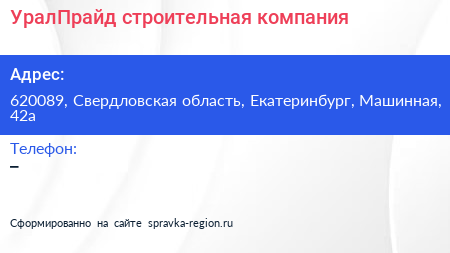 УралПрайд, строительная компания по адресу 620089, Свердловская область, Екатеринбург, Машинная, 42а в дальнейшем Организация, размещена в следующих категориях: