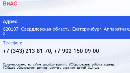 ВиАС по адресу 620137, Свердловская область, Екатеринбург, Аппаратная, 3 в дальнейшем Организация, размещена в следующих категориях: