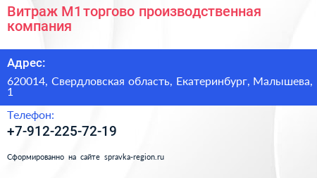 Витраж М1, торгово-производственная компания по адресу 620014, Свердловская область, Екатеринбург, Малышева, 1 в дальнейшем Организация, размещена в следующих категориях: