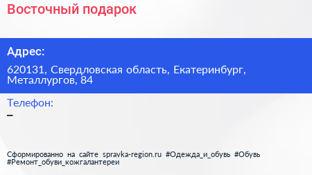 Восточный подарок по адресу 620131, Свердловская область, Екатеринбург, Металлургов, 84 в дальнейшем Организация, размещена в следующих категориях: