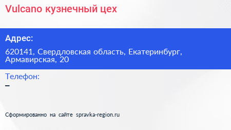 Vulcano, кузнечный цех по адресу 620141, Свердловская область, Екатеринбург, Армавирская, 20 в дальнейшем Организация, размещена в следующих категориях:
