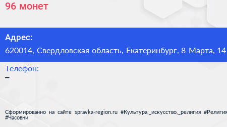 96 монет по адресу 620014, Свердловская область, Екатеринбург, 8 Марта, 14 в дальнейшем Организация, размещена в следующих категориях:
