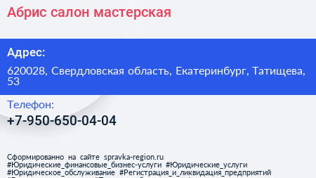 Абрис, салон-мастерская по адресу 620028, Свердловская область, Екатеринбург, Татищева, 53 в дальнейшем Организация, размещена в следующих категориях: