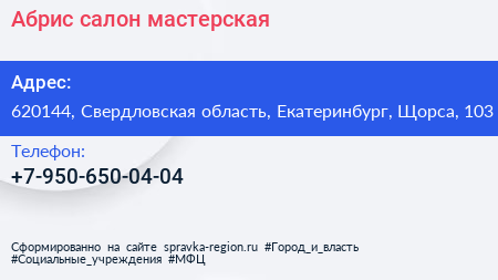 Абрис, салон-мастерская по адресу 620144, Свердловская область, Екатеринбург, Щорса, 103 в дальнейшем Организация, размещена в следующих категориях: