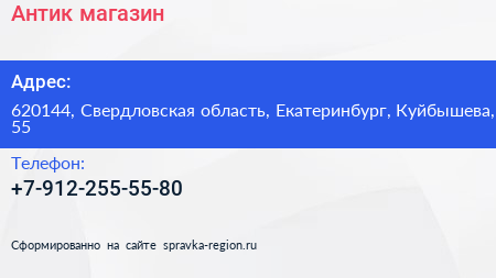 Антик, магазин по адресу 620144, Свердловская область, Екатеринбург, Куйбышева, 55 в дальнейшем Организация, размещена в следующих категориях: