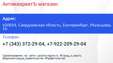 АнтиквариатЪ, магазин по адресу 620014, Свердловская область, Екатеринбург, Малышева, 16 в дальнейшем Организация, размещена в следующих категориях: