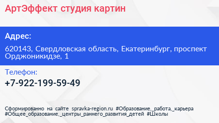 АртЭффект, студия картин по адресу 620143, Свердловская область, Екатеринбург, проспект Орджоникидзе, 1 в дальнейшем Организация, размещена в следующих категориях: