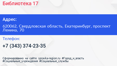 Библиотека №17 по адресу 620062, Свердловская область, Екатеринбург, проспект Ленина, 70 в дальнейшем Организация, размещена в следующих категориях: