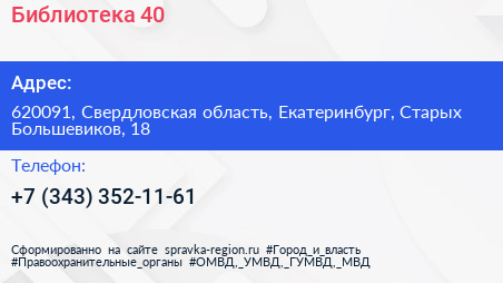 Библиотека №40 по адресу 620091, Свердловская область, Екатеринбург, Старых Большевиков, 18 в дальнейшем Организация, размещена в следующих категориях: