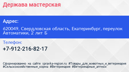 Держава, мастерская по адресу 620049, Свердловская область, Екатеринбург, переулок Автоматики, 2 лит Б в дальнейшем Организация, размещена в следующих категориях: