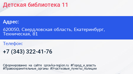 Детская библиотека №11 по адресу 620050, Свердловская область, Екатеринбург, Техническая, 81 в дальнейшем Организация, размещена в следующих категориях: