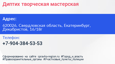 Диптих, творческая мастерская по адресу 620026, Свердловская область, Екатеринбург, Декабристов, 16/18г в дальнейшем Организация, размещена в следующих категориях: