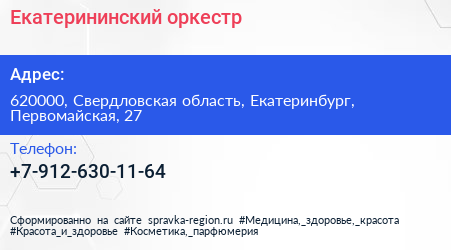 Екатерининский оркестр по адресу 620000, Свердловская область, Екатеринбург, Первомайская, 27 в дальнейшем Организация, размещена в следующих категориях: