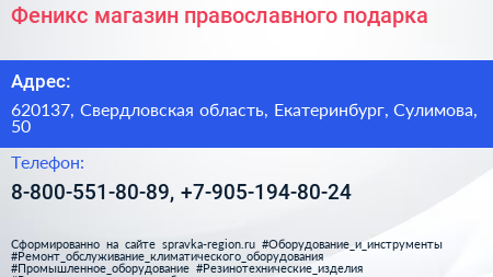 Феникс, магазин православного подарка по адресу 620137, Свердловская область, Екатеринбург, Сулимова, 50 в дальнейшем Организация, размещена в следующих категориях: